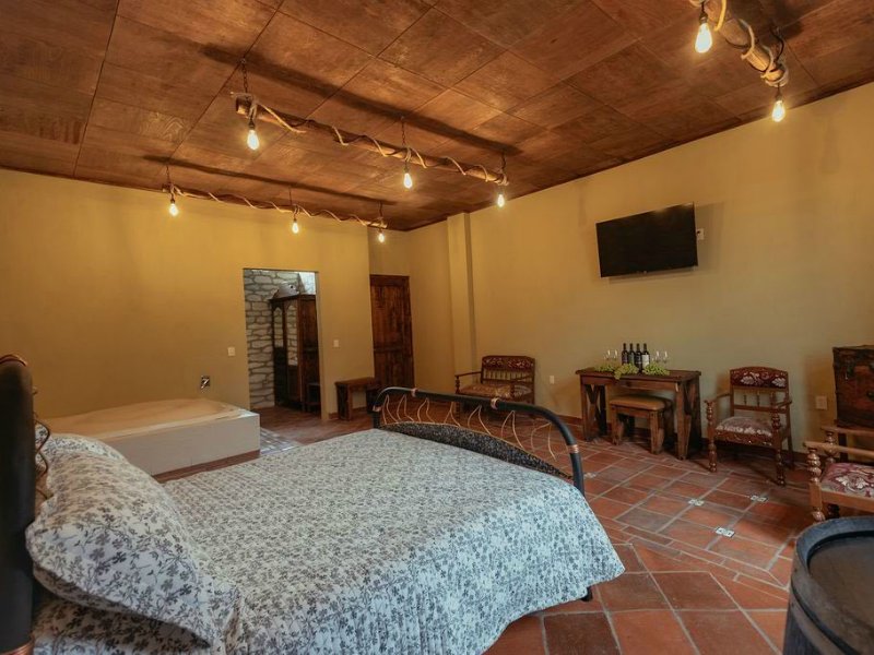 - Servicios Aire acondicionado / Calefacción, Área de estar con sillones o sofá, Baño privado con regadera, Bata y pantuflas, Botella de vino de cortesía, Botellas de agua de cortesía, Cafetera con cápsulas de cortesía, Cama king size, Copas de vino en habitación, Decoración personalizada con detalles sensoriales, Desayuno americano incluido, Espacio para montaje romántico, Kit de baño, Mayor amplitud y privacidad, Minibar (con costo adicional), Servicio de limpieza, Tina de hidromasaje privada, Toallas faciales y de baño, Vista a jardines o viñedos, Vista panorámica al Valle de Barranquillas, WiFi gratuito